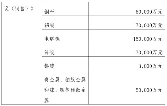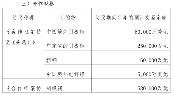 具体交易内容包括:采购方面,中国境外阴极铜预计年交易金额为6亿美元,广东省阴极铜为25亿元人民币,粗铜为6亿元人民币,中国境外电解镍为5000万美元;销售方面丰益国际,阴极铜预计年交易额为58亿元人民币,铜杆5亿元人民币、铝锭7亿元人民币、电解镍15亿元人民币、锌锭7亿元人民币、锡锭3000万元人民币,以及贵金属和稀散金属5亿元。